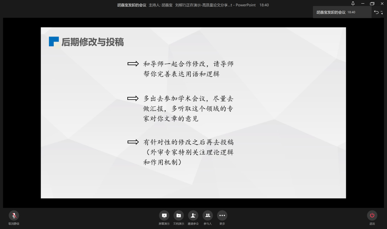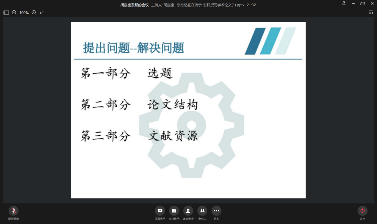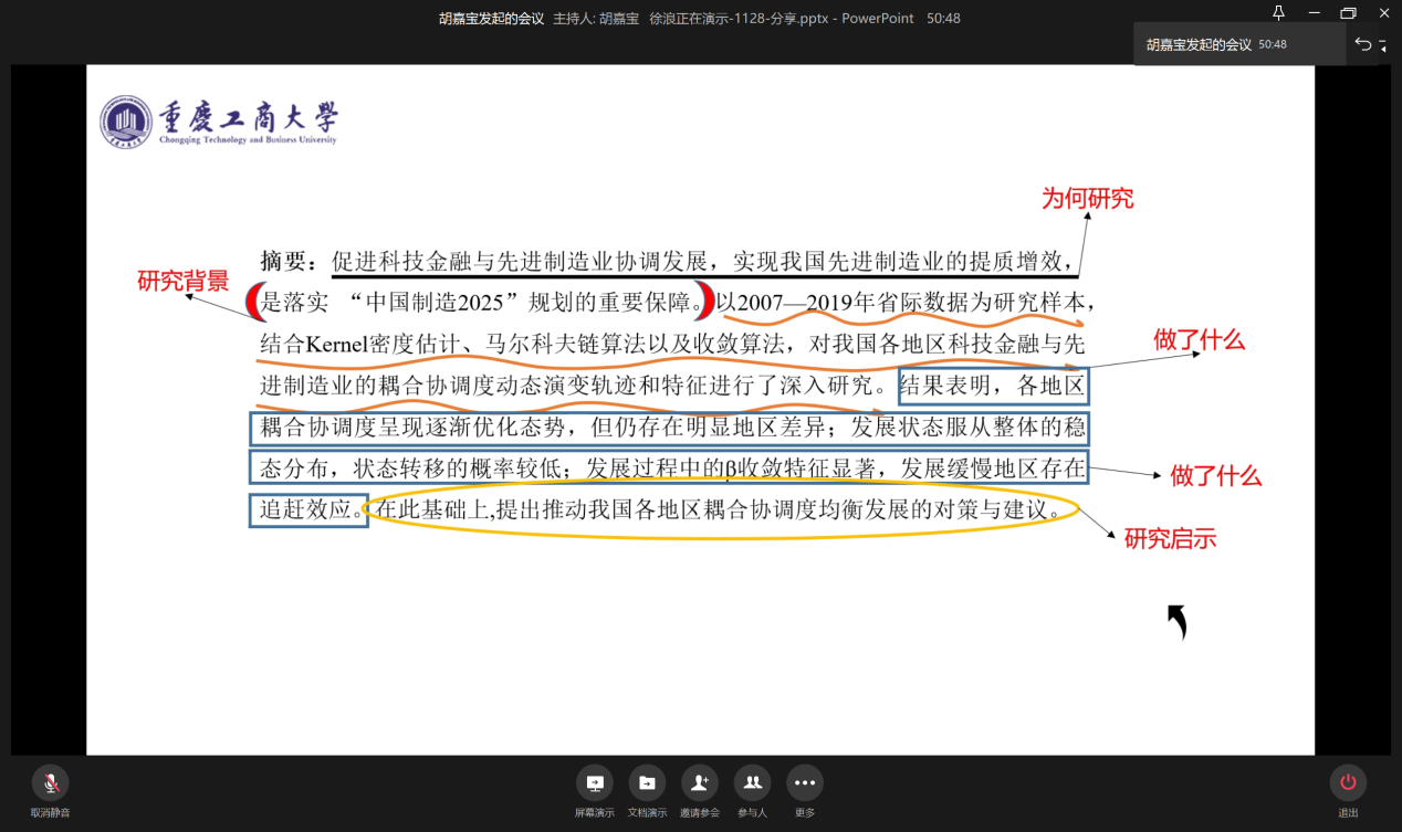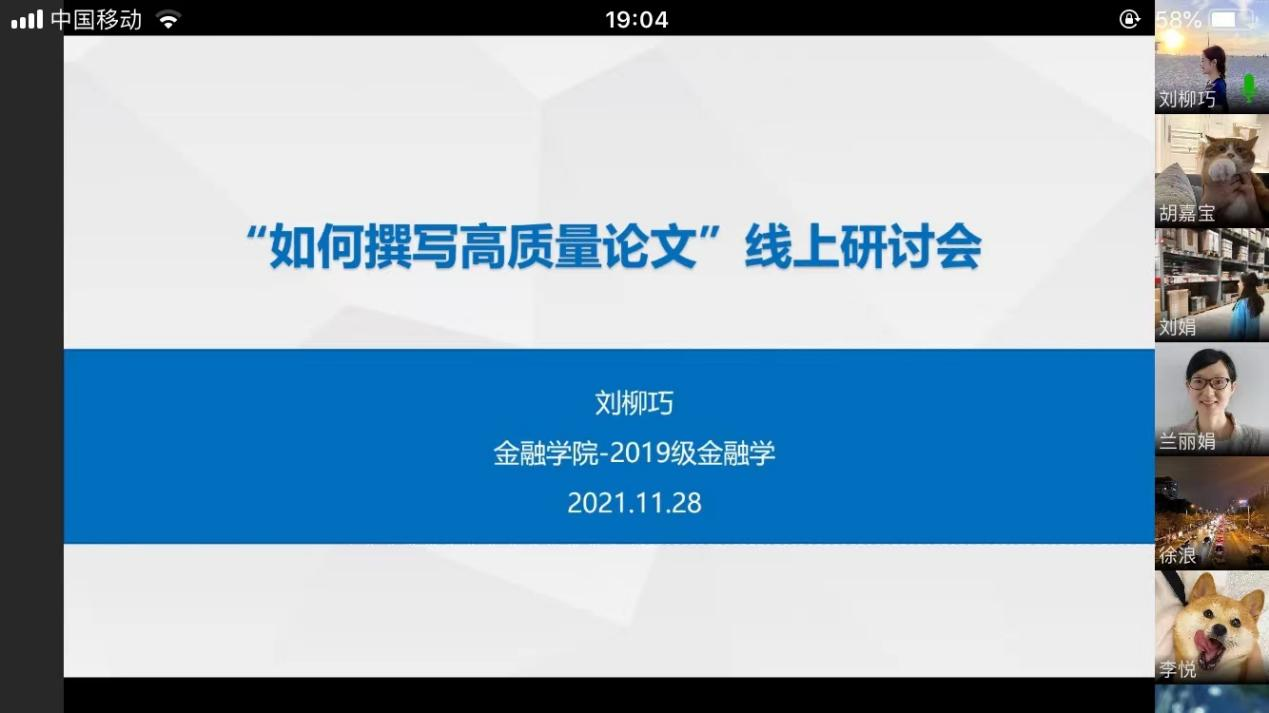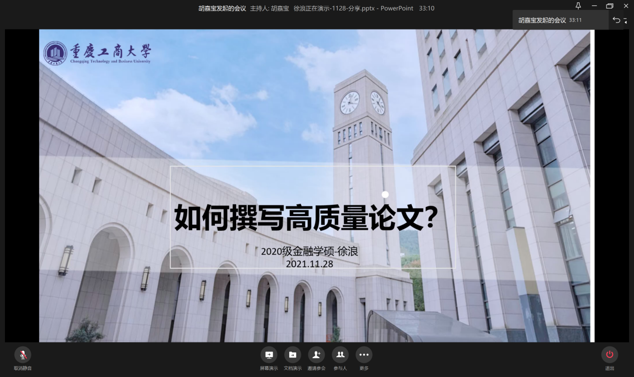 11月28日晚19:00,为提升学生论文撰写水平,营造良好的学术氛围,英国正版365官方网站研分会在企业微信线上举行“如何撰写高质量论文”分享会。